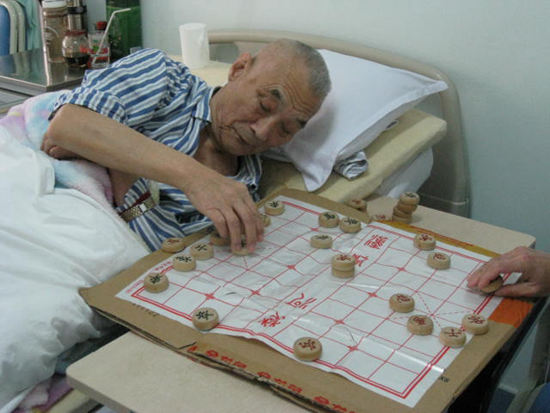 德勝社區(qū)衛(wèi)生服務(wù)中心臨終關(guān)懷科一位正在下象棋的老爺爺。該科室護(hù)士長(zhǎng)劉曉惠說(shuō),這位老爺爺唯一的愛(ài)好就是下象棋,“要是下跳棋我們還能陪一陪,象棋都不會(huì)”。于是,醫(yī)院便找了一位會(huì)下棋的護(hù)工陪這位老爺爺下象棋。圖片中下象棋用的硬紙板也是護(hù)士們幫忙做的。德勝社區(qū)衛(wèi)生服務(wù)中心臨終關(guān)懷科供圖