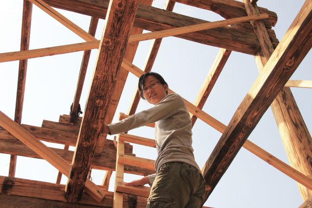 隨后,“女人不能跨過木料”的納西“禁忌”被化解了。“這個漢族女娃是北京來的博士,是來研究咱們蓋房子的,咱們的規(guī)矩不管她。”掌墨的大師傅楊昌明說。