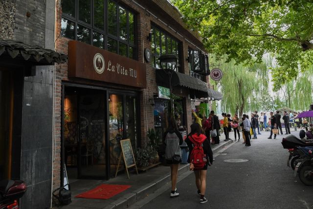 游客從“初心”咖啡館的門前經(jīng)過??拷贾菽仙铰返摹俺跣摹笨Х瑞^以前是“東籬會所”,如今成了別有風味的大眾咖啡館。新華社記者 黃宗治 攝