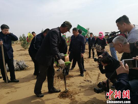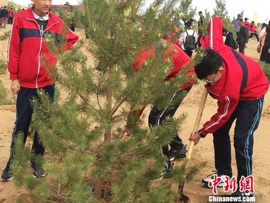 圖為在庫(kù)布其沙漠上舉行的“大型義務(wù)植樹(shù)活動(dòng)”現(xiàn)場(chǎng)。李愛(ài)平 攝