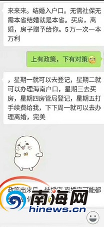 4月22日晚,海南省政府召開《中共海南省委辦公廳海南省人民政府辦公廳關(guān)于進(jìn)一步穩(wěn)定房地產(chǎn)市場(chǎng)的通知》新聞發(fā)布會(huì),公布全省實(shí)施全域限購(gòu)。隨即,朋友圈流傳“星期一登記結(jié)婚、星期二辦理海南戶口、星期三買房、星期四登記(結(jié)婚)、星期五打(假結(jié)婚)手續(xù)費(fèi)、下周一離婚”等傳言和段子。南海網(wǎng)記者從海南省公安廳、海口市民政局等部門了解到,此類登記結(jié)婚就可立即辦理落戶海南等傳言均不可能實(shí)現(xiàn)。