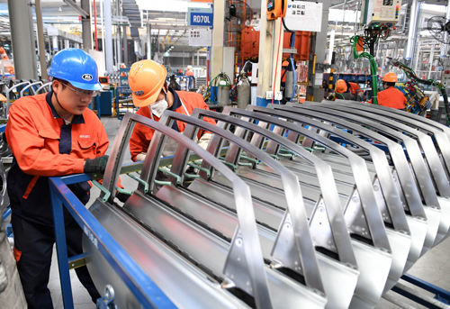 2018年3月27日,工人們?cè)谡憬R海的吉利汽車生產(chǎn)車間工作 殷博古 攝