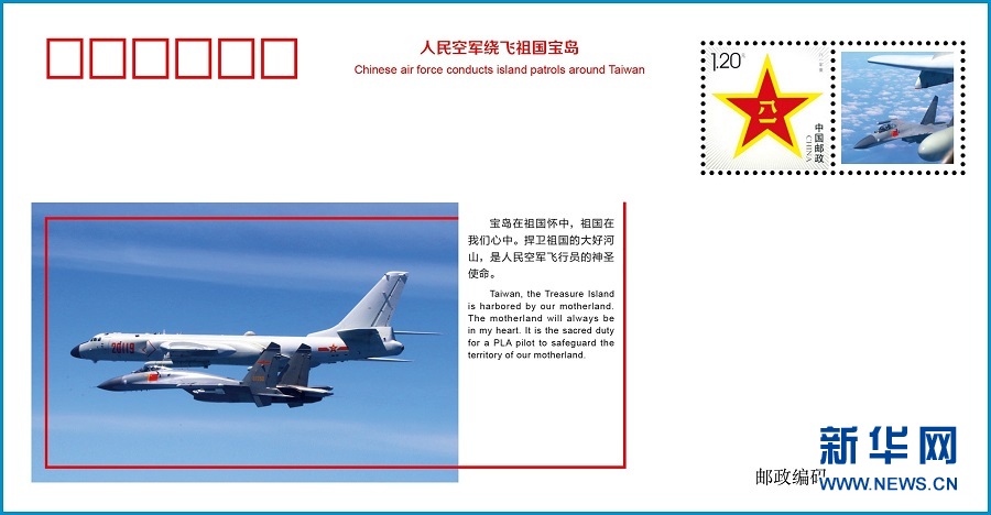 紀(jì)念封、宣傳片所用戰(zhàn)機(jī)巡航影像,均為人民空軍飛行員執(zhí)行繞島巡航任務(wù)中航拍的。“寶島在祖國(guó)懷中,祖國(guó)在我們心中。捍衛(wèi)祖國(guó)的大好河山,是人民空軍飛行員的神圣使命?!保访都o(jì)念封傳遞了空軍飛行員這一共同心聲。