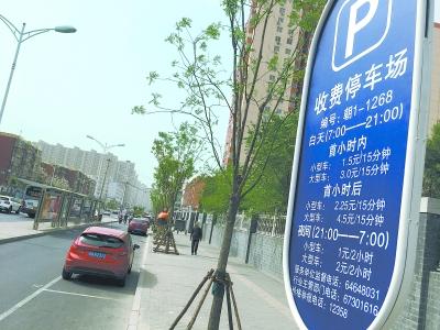 路側(cè)停車一刻鐘免費(fèi),已經(jīng)在正規(guī)管理的停車場實(shí)施了,但路側(cè)停車的收費(fèi)牌卻大多還未更新。 記者 甘南 攝