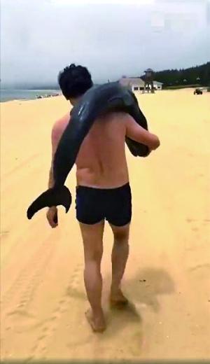 昨天,網絡流傳的多段視頻顯示,一名身穿泳衣的男子疑似背上扛著一只海豚在沙灘行走(見圖)。多位網友回復稱,該事件發(fā)生于廣東陽江市海陵島沙灘附近,涉事男子直接把海豚扛走。