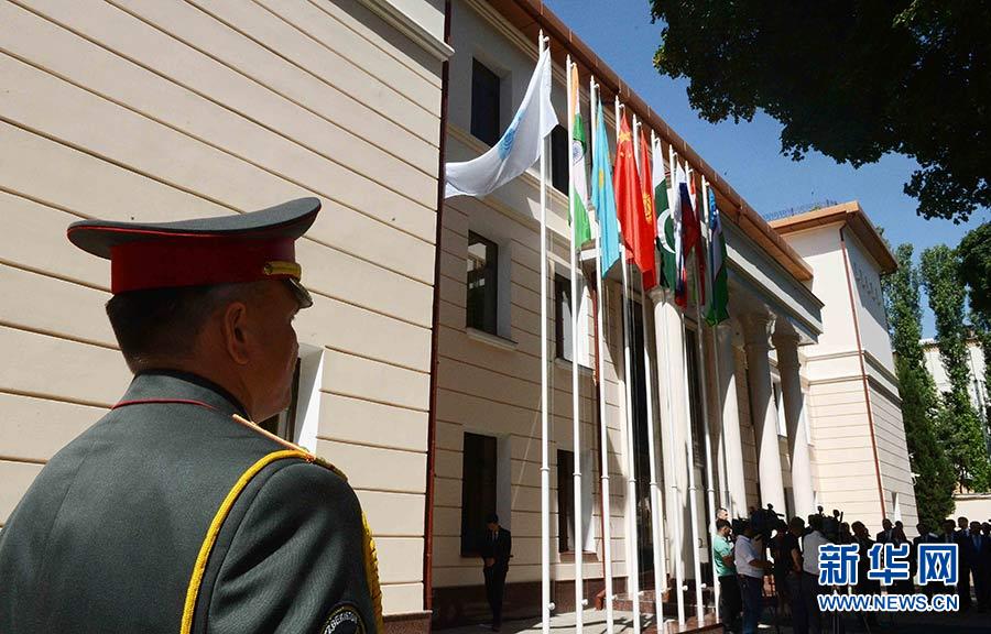 2017年6月15日,上海合作組織地區(qū)反恐怖機(jī)構(gòu)執(zhí)委會(huì)在烏茲別克斯坦首都塔什干舉行印度和巴基斯坦國旗升旗儀式,迎接兩個(gè)新成員的加入。新華社記者 沙達(dá)提 攝
