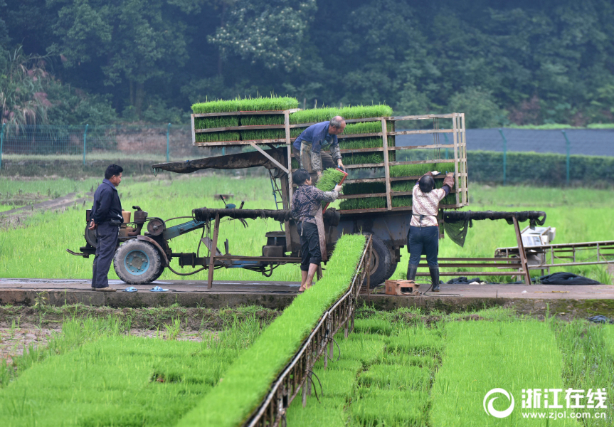 6月4日,武義縣一育秧工廠員工忙著為訂單農(nóng)戶起運(yùn)單季稻秧苗。隨著“芒種”節(jié)氣的到來(lái),武義縣農(nóng)民搶抓有利時(shí)機(jī),加快翻耕平整水田,搶種單季水稻。(浙江在線拍友 張建成 攝)