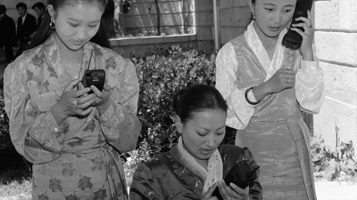 1993年8月14日西藏拉薩正式開通“大哥大”成了新聞頭條(新華社記者 范長國攝),而2018年5月2日,在珠穆朗瑪峰旅游大本營一家?guī)づ衤灭^內(nèi),游客用手機(jī)上網(wǎng)已是司空見慣(新華社記者 黃浩銘 攝)。