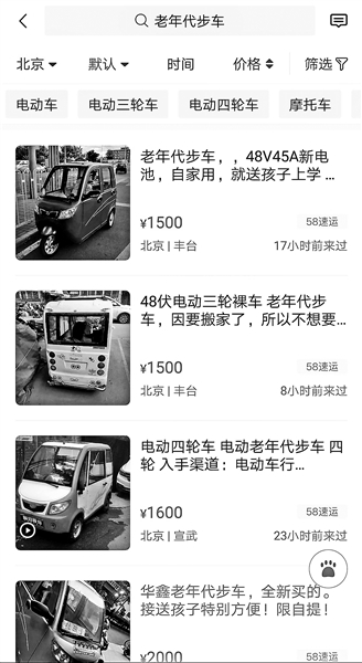 北青報記者在“閑魚”“轉(zhuǎn)轉(zhuǎn)”等二手貨交易平臺上鍵入“老年代步車”后,可以搜索上百條等待交易的信息,有大興、豐臺、順義、東城、朝陽等地車主發(fā)布的交易信息,“北京車主看車方便”,多為當(dāng)面交易。