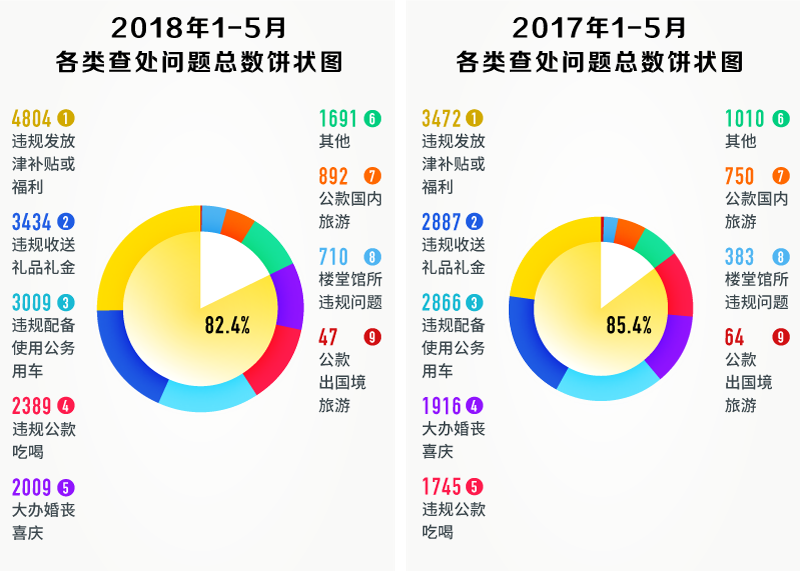 2017年、2018年1-5月各類查處問題總數(shù)餅狀圖,違規(guī)發(fā)放津補貼或福利、違規(guī)收送禮品禮金、違規(guī)配備使用公務(wù)用車、違規(guī)公款吃喝、大辦婚喪喜慶等“老問題”占比較大,均超80%