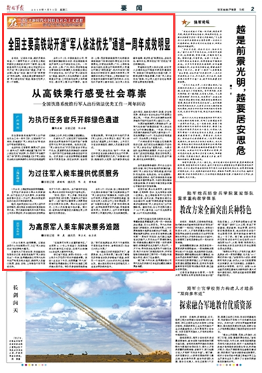 去年8月1日,中國鐵路總公司、軍委后勤保障部聯(lián)合決定,在全國鐵路系統(tǒng)開展軍人出行依法優(yōu)先工作。這項(xiàng)政策實(shí)施一年來成效如何?記者走進(jìn)高鐵站進(jìn)行了采訪調(diào)查,實(shí)地探訪“軍人依法優(yōu)先”給官兵出行帶來的新變化。請關(guān)注今天出版的《解放軍報(bào)》的報(bào)道——