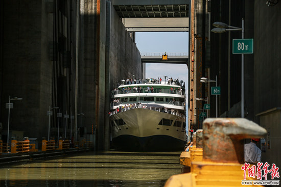 7月31日,湖北省宜昌市,船只準備進入三峽大壩升船機,進入廂體后這艘100多米長的客船將乘升船機下降80多米,“翻越”大壩。三峽升船機是世界上規(guī)模最大的升船機,也是三峽工程的收官之作。中國青年報·中青在線記者 趙迪/攝