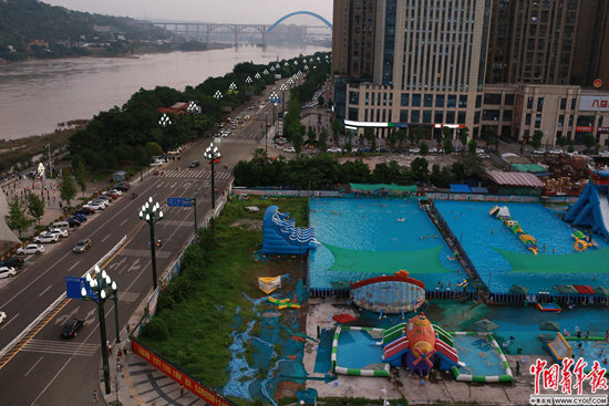 云南省昭通市水富縣,長江上游金沙江畔,市民在水中納涼。金沙江、橫江、長江三江在水富交匯。
