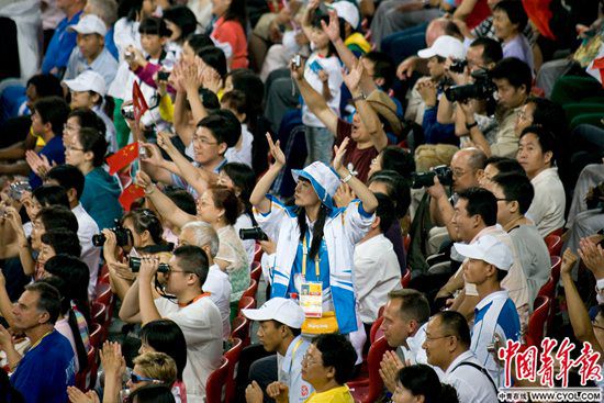 2008年8月21日,國(guó)家體育場(chǎng)“鳥巢”,志愿者帶領(lǐng)觀眾為運(yùn)動(dòng)員鼓掌。中國(guó)青年報(bào)·中青在線記者 陳劍/攝