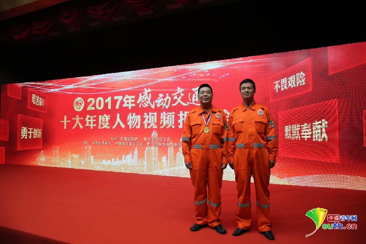 鐘海鋒(左)與鐘佛軍(右)在2017年感動(dòng)交通十大年度人物頒獎(jiǎng)現(xiàn)場。本人供圖