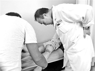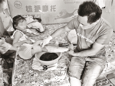 欣欣側(cè)身坐臥在床上,戴著塑膠手套的張志成正在為女兒換藥。右腿膝蓋后窩處的傷口面積很大,夏天化膿尤為嚴(yán)重,平常清洗創(chuàng)面、換藥這些事對(duì)張志成來(lái)說(shuō)已經(jīng)輕車熟路了。懂事的欣欣沒(méi)有哭鬧,也沒(méi)有喊疼。