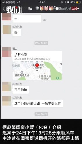 小李還于24日16時左右于永嘉上塘派出所報案,其間警方通過趙某朋友的手機與滴滴平臺溝通要求獲得司機具體信息(電話、車牌等),但無果。上塘派出所民警證實,昨天派出所內(nèi)有民警參與處理該起事件。