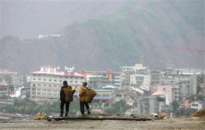 2008年6月22日,北川萬名災(zāi)民雨中搬家。資料圖片/新京報(bào)記者 薛珺 攝