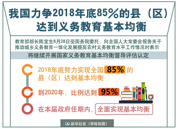 新華社北京8月28日電(記者胡浩)教育部部長陳寶生28日受國務院委托,向全國人大常委會報告關于推動城鄉(xiāng)義務教育一體化發(fā)展提高農(nóng)村義務教育水平工作情況時表示,將繼續(xù)開展國家義務教育基本均衡督導評估認定,2018年底努力實現(xiàn)全國85%的縣(區(qū))達到基本均衡,到2020年,比例達到95%;在本屆政府任期內,全面實現(xiàn)基本均衡。
