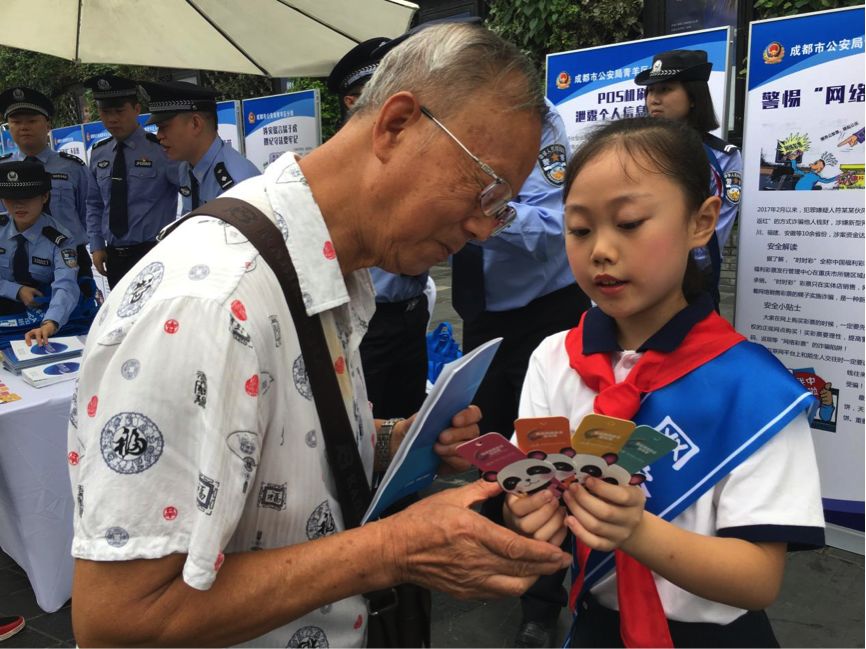 “如果收到信息,說您的家人受傷需要匯款,肯定是詐騙電話。卡片后面有四個(gè)詐騙的典型案例,爺爺您可以了解一下?!鄙俪切W(xué)四年級(jí)的李彥孜一邊拿著精巧可愛的網(wǎng)絡(luò)安全知識(shí)熊貓書簽,一邊用稚嫩的聲音做介紹。李彥孜是宣傳網(wǎng)絡(luò)安全的小志愿者,她告訴傳播君,這些網(wǎng)絡(luò)安全知識(shí)都是用課余時(shí)間去了解的,“多一個(gè)人知道,就少一個(gè)人受害”。
