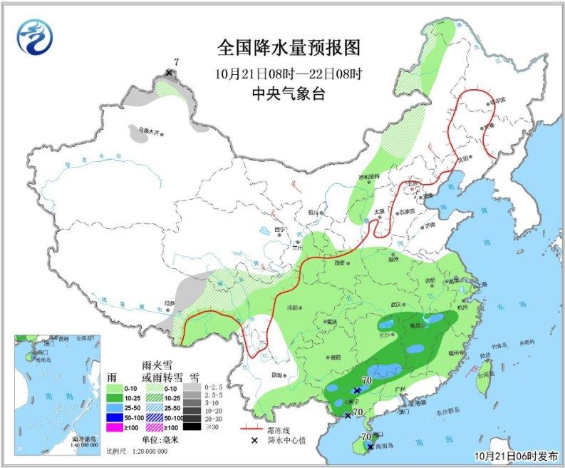 10月21日08時至22日08時,新疆塔城和阿勒泰地區(qū)、內(nèi)蒙古東部、青海南部、西藏東部、川西高原北部等地的部分地區(qū)有小到中雪或雨夾雪,其中阿勒泰北部局地有大雪。江南中西部、華南西部和北部、海南島中東部等地有中到大雨,其中廣西中部和南部沿海、海南島東南部等地的局部地區(qū)有暴雨(50~70毫米)。內(nèi)蒙古西部、甘肅中部有4~5級偏北風(fēng)(見圖1)。