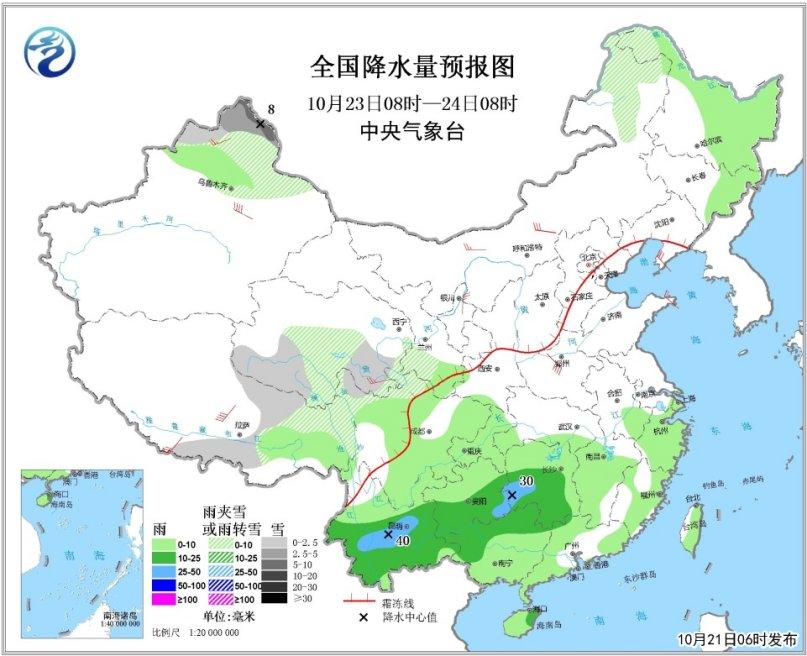 10月22日08時至23日08時,新疆阿勒泰地區(qū)、內(nèi)蒙古東北部、西藏東部、青海南部、甘肅中部、川西高原北部等地部分地區(qū)有小雪或雨夾雪,其中,阿勒泰北部局地有大雪(5~7毫米)。吉林東部、遼寧東部、云南東部、四川盆地西北部、廣西大部和廣東西部等地部分地區(qū)有中到大雨,其中,云南東南部和廣西西南部等地的局部地區(qū)有暴雨(50~55毫米)。新疆北部、甘肅中部、內(nèi)蒙古中東部和遼寧中部等地部分地區(qū)有4~6級風(fēng)(見圖2)。