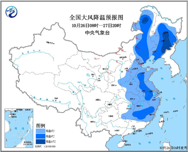 圖為全國大風降溫預報圖(26日08時-27日20時)