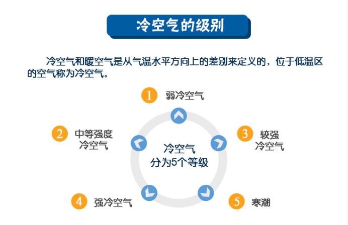 根據(jù)強弱程度,我國將冷空氣分為五個等級:弱冷空氣、中等強度冷空氣、較強冷空氣、強冷空氣和寒潮。