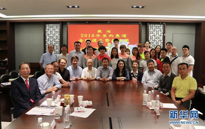 2016年,里約奧運(yùn)會大陸金牌選手和教練交流團(tuán)到“中華兩岸經(jīng)貿(mào)投資文化教育協(xié)會”座談交流時(shí)合影。協(xié)會由黃紫玉(前排右五)在2009年發(fā)起成立,成為兩岸民間交流的一個(gè)平臺(受訪者供圖)。 新華社發(fā)