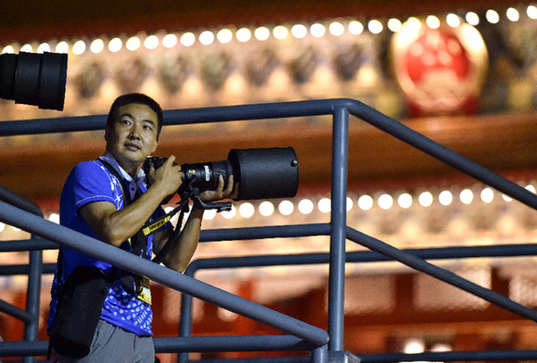 圖為2015年9月3日,羅曉光在天安門城樓前金水橋上的點(diǎn)位等候幾個(gè)小時(shí)后將進(jìn)行的閱兵。