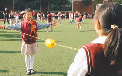 武漢市紅領(lǐng)巾學校學生在操場上分組玩“穿梭拉拉球”游戲。本報記者 田豆豆攝