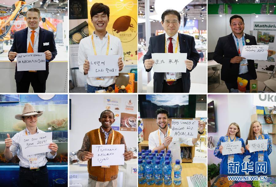 11月10日,進(jìn)博會(huì)上不同國(guó)家的參展人員展示用不同語(yǔ)言書(shū)寫(xiě)的“明年見(jiàn)”(拼版照片)。 首屆中國(guó)國(guó)際進(jìn)口博覽會(huì)11月5日至10日在上海舉行。記者在采訪中了解到,很多參展商在進(jìn)博會(huì)上收獲了不少訂單,宣傳了自己的產(chǎn)品,結(jié)識(shí)了很多朋友。他們表示,希望明年再來(lái)進(jìn)博會(huì)。 新華社記者 侯東濤 攝