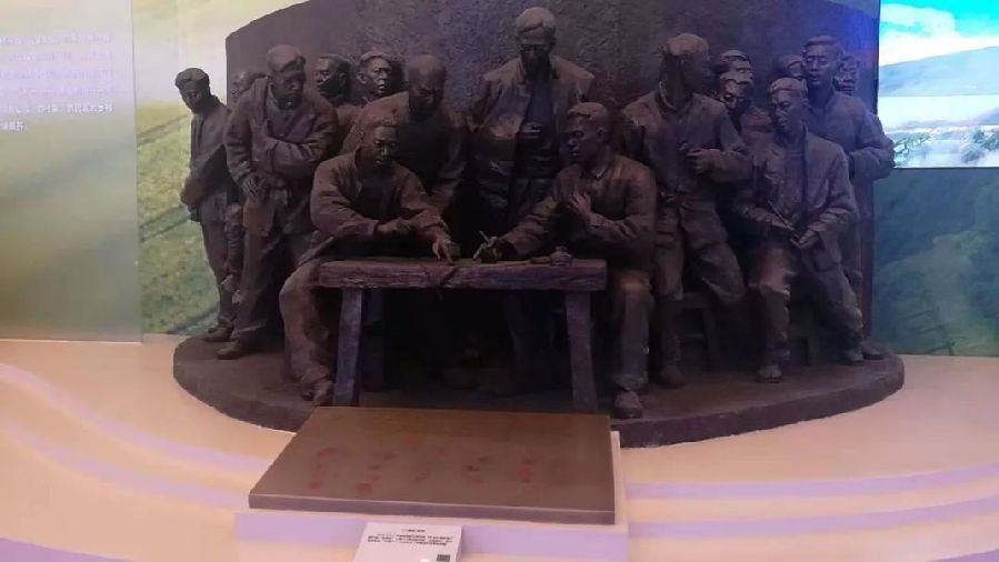 “我們的家鄉(xiāng),在希望的田野上?!?978年冬,安徽鳳陽縣小崗村18位農(nóng)民堅(jiān)定地按下紅手印,實(shí)施包產(chǎn)到戶,拉開了中國農(nóng)村改革的大幕,成為中國改革的標(biāo)志。這座雕塑讓我們重溫那個(gè)永載歷史的瞬間。