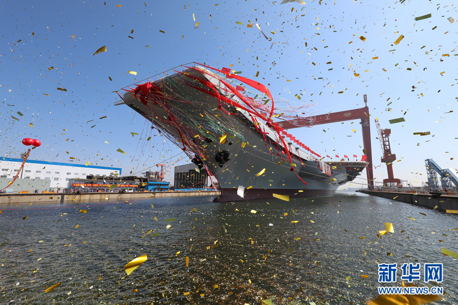 我國第二艘航空母艦下水儀式在中國船舶重工集團公司大連造船廠舉行(2017年4月26日攝)。 新華社記者 李剛 攝