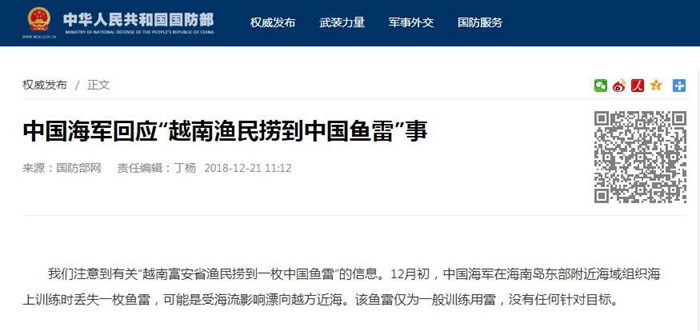 我們注意到有關(guān)“越南富安省漁民撈到一枚中國魚雷”的信息。12月初,中國海軍在海南島東部附近海域組織海上訓(xùn)練時(shí)丟失一枚魚雷,可能是受海流影響漂向越方近海。該魚雷僅為一般訓(xùn)練用雷,沒有任何針對(duì)目標(biāo)。