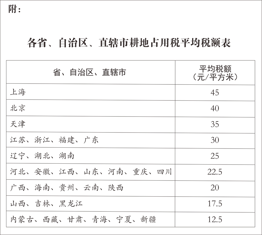 各地區(qū)耕地占用稅的適用稅額,由省、自治區(qū)、直轄市人民政府根據(jù)人均耕地面積和經(jīng)濟(jì)發(fā)展等情況,在前款規(guī)定的稅額幅度內(nèi)提出,報(bào)同級(jí)人民代表大會(huì)常務(wù)委員會(huì)決定,并報(bào)全國(guó)人民代表大會(huì)常務(wù)委員會(huì)和國(guó)務(wù)院備案。各省、自治區(qū)、直轄市耕地占用稅適用稅額的平均水平,不得低于本法所附《各省、自治區(qū)、直轄市耕地占用稅平均稅額表》規(guī)定的平均稅額。