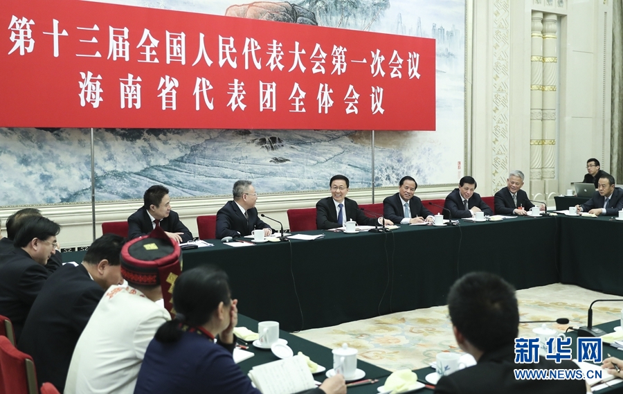 韓正在海南代表團(tuán)參加審議。在認(rèn)真聽取劉賜貴、沈曉明、陳飄等代表發(fā)言后,韓正說,完全贊同全國(guó)人大常委會(huì)工作報(bào)告。報(bào)告圍繞中心、突出重點(diǎn)、客觀實(shí)在,通篇貫穿了習(xí)近平新時(shí)代中國(guó)特色社會(huì)主義思想,體現(xiàn)了堅(jiān)持黨的領(lǐng)導(dǎo)、人民當(dāng)家作主、依法治國(guó)的有機(jī)統(tǒng)一。韓正說,海南在國(guó)家發(fā)展全局中地位作用更顯重要,要以習(xí)近平新時(shí)代中國(guó)特色社會(huì)主義思想為指導(dǎo),落實(shí)黨中央決策部署和習(xí)近平總書記對(duì)海南發(fā)展的重要指示精神,以慶祝改革開放40周年和海南建省辦經(jīng)濟(jì)特區(qū)30周年為契機(jī),以國(guó)際旅游島建設(shè)為總抓手,把保護(hù)生態(tài)環(huán)境放在優(yōu)先位置,加快建設(shè)經(jīng)濟(jì)繁榮、社會(huì)文明、生態(tài)宜居、人民幸福的美好新海南。
