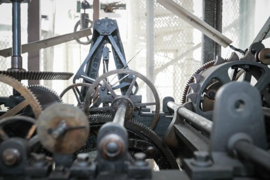 大鐘機芯內(nèi),大量齒輪互相咬合,直徑超過12毫米的鋼絲繩代替了普通鐘表中精細的鋼絲。(海沙爾 攝)