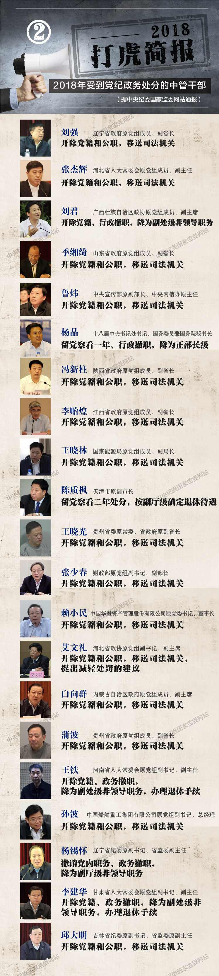 ——嚴(yán)重違紀(jì)、嚴(yán)重觸犯刑律的黨員必須開除黨籍;涉及嚴(yán)重違法犯罪,必須移送司法機(jī)關(guān)。2018年公布處理結(jié)果的21名中管干部里,18人被開除黨籍,15人被移送檢察機(jī)關(guān)審查起訴。