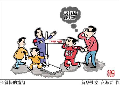 為人父母者,都希望自己的孩子長成“大高個兒”,但“大高個兒”也常常遇到煩惱,比如因為個子超過“限高”,很多兒童無法享受相應(yīng)的購票優(yōu)惠。長得快的兒童也是兒童,基于身高制定的兒童優(yōu)惠標(biāo)準(zhǔn)能不能與時俱進(jìn),讓“個兒大”的孩子也能享受針對兒童的優(yōu)惠政策?