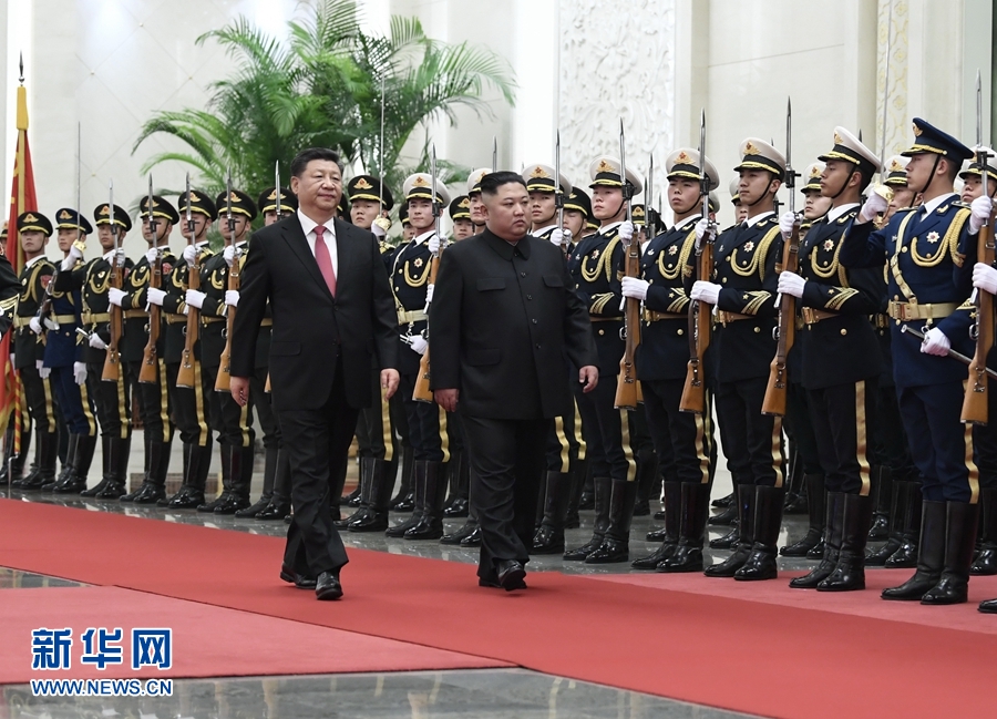 1月8日,中共中央總書記、國(guó)家主席習(xí)近平同當(dāng)日抵京的朝鮮勞動(dòng)黨委員長(zhǎng)、國(guó)務(wù)委員會(huì)委員長(zhǎng)金正恩舉行會(huì)談。會(huì)談前,習(xí)近平在人民大會(huì)堂北大廳為金正恩舉行歡迎儀式。 新華社記者 申宏 攝