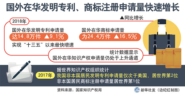 新華社北京1月11日電(記者張泉)記者10日從國家知識產(chǎn)權(quán)局獲悉,2018年,國外在華發(fā)明專利申請量、商標(biāo)注冊申請量快速增長,國際社會對中國知識產(chǎn)權(quán)保護(hù)的信心持續(xù)增強(qiáng)。