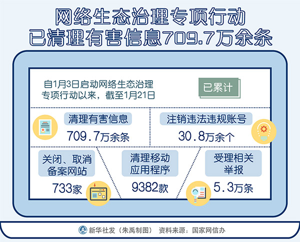 新華社北京1月23日電(記者史競(jìng)男、白瀛)記者23日從國家網(wǎng)信辦獲悉,自1月3日啟動(dòng)網(wǎng)絡(luò)生態(tài)治理專項(xiàng)行動(dòng)以來,截至1月21日,已累計(jì)清理有害信息709.7萬余條,注銷違法違規(guī)賬號(hào)30.8萬余個(gè),關(guān)閉、取消備案網(wǎng)站733家,清理移動(dòng)應(yīng)用程序9382款,受理相關(guān)舉報(bào)5.3萬條。