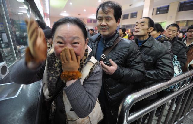 2013年,長沙火車站售票窗口前,工作人員告知一位女士當(dāng)年2月14號長沙至廣州的臥鋪還有余票后,這位女士難掩喜悅。(新華社記者 李尕 攝)