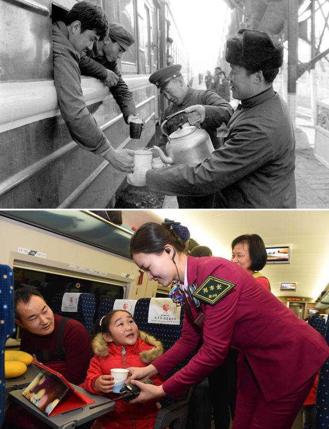 上圖:1984年春節(jié)期間,在石家莊火車站,工作人員為過往旅客送開水。(新華社記者 趙連升 攝);下圖:2016年,南昌鐵路局福州客運段列車工作人員廖輝為一名小乘客送去熱水。(新華社記者 姜克紅 攝)