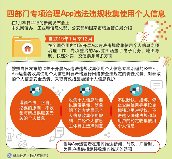 新華社北京1月25日電(記者王鵬)在25日舉行的新聞發(fā)布會(huì)上,中央網(wǎng)信辦、工業(yè)和信息化部、公安部和國家市場監(jiān)管總局介紹,自2019年1月至12月,在全國范圍內(nèi)組織開展App違法違規(guī)收集使用個(gè)人信息專項(xiàng)治理工作,專項(xiàng)整治的App范圍涵蓋了電子商務(wù)、地圖導(dǎo)航、快遞外賣、交通票務(wù)等多方面。