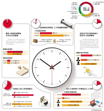 2018年,國家統(tǒng)計局組織開展了第二次全國時間利用調查,該調查覆蓋11個?。ㄊ校?,采用國家統(tǒng)一的住戶收支與生活狀況調查樣本框,共抽樣調查20226戶48580人。昨日,《2018年全國時間利用調查公報》出爐,結果顯示,與2008年相比,中國居民的時間分配結構發(fā)生了較大變化,睡覺休息和用餐時間增加,收入越低的居民看電視時間越多,每天上網(wǎng)時間增加2小時28分鐘。