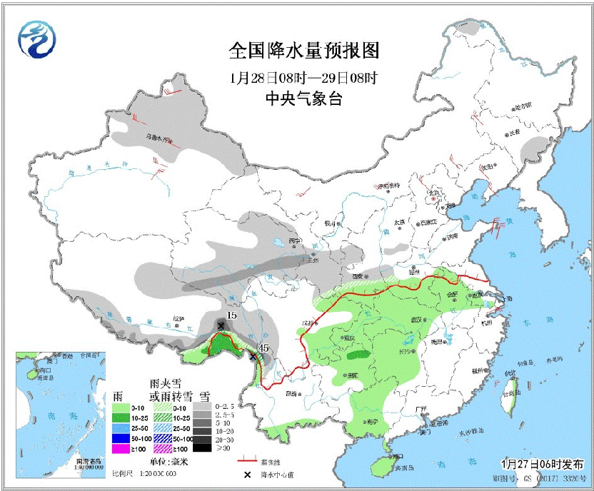 在降水方面,1月28日至30日,新疆北部、青藏高原、甘肅、寧夏、陜西中北部、山西等地部分地區(qū)將有小雪或雨夾雪,局地中雪;陜西南部、湖北北部和中西部、河南、山東中南部、蘇皖中北部等地將有雨轉(zhuǎn)雪或雨夾雪,部分地區(qū)有大到暴雪,降雪主要出現(xiàn)在30日夜間;湖北東部、江蘇和安徽等地局地有大雨。另外,28日至29日,云南西北部有中到大雨、局地暴雨。