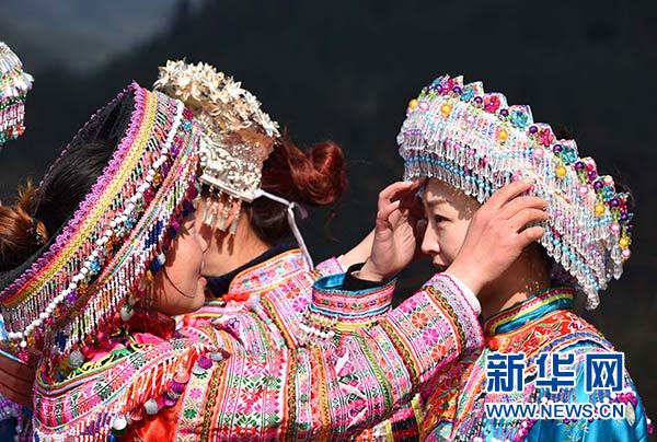 四川省敘永縣后山鎮(zhèn)三斗米村苗族婦女為游客(右)整理服飾(1月16日攝)。新華社記者 陳天湖 攝