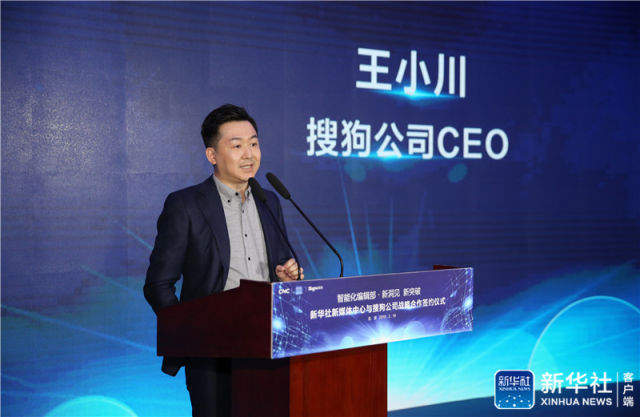 2月19日,新華社聯(lián)合搜狗公司在京發(fā)布全新升級的站立式AI合成主播并推出全球首個(gè)AI合成女主播。圖為搜狗公司CEO王小川致辭。新華社記者 肖磊濤 攝
